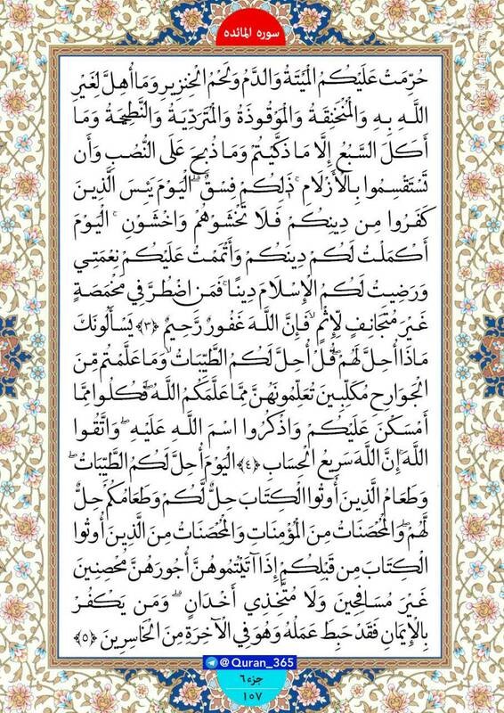 روز خود را با قرائت آیاتی از صفحه ۱۰۷ از سوره مائده (جزء ششم) آغاز کنید.