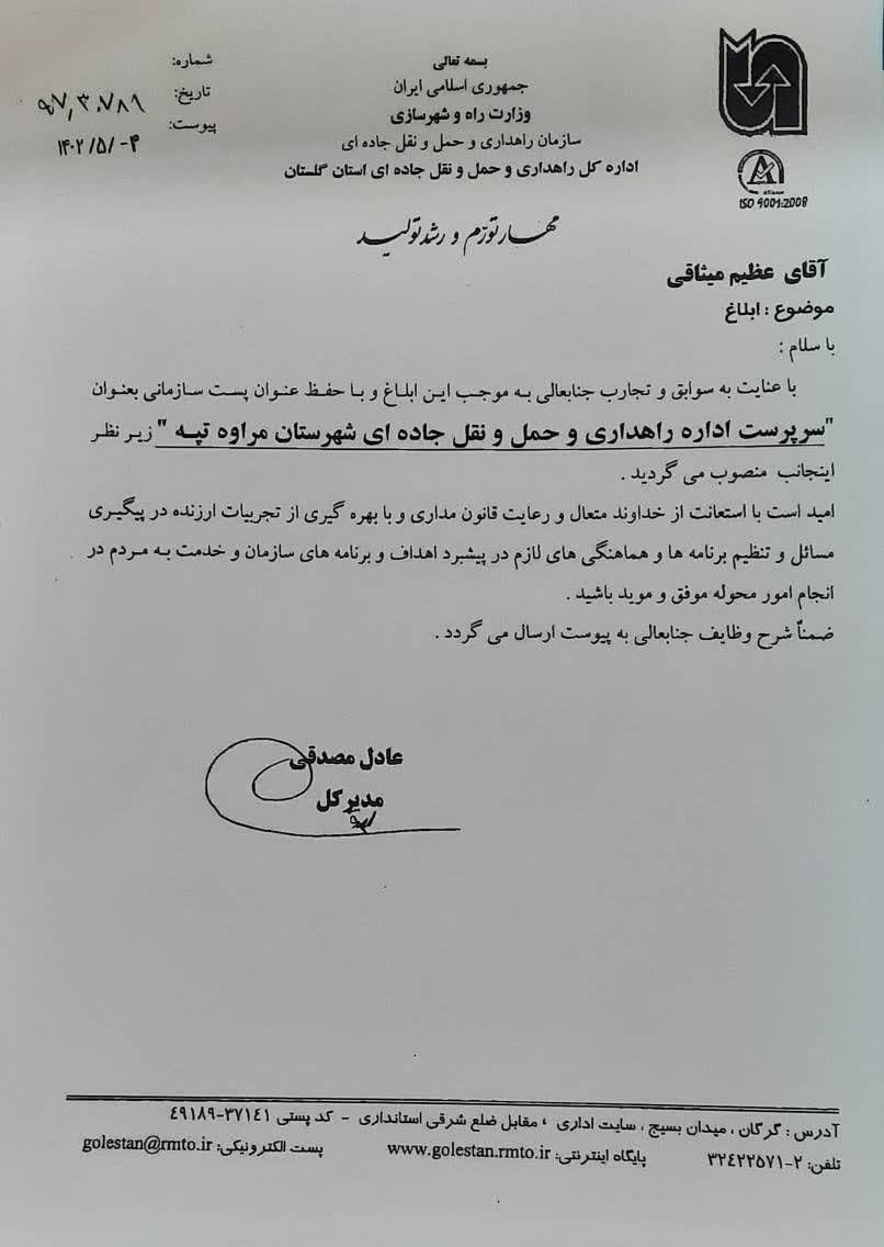 با ابلاغ مدیرکل اداره حمل و نقل جادهای گلستان، عظیم میثاقی با حفظ سمت قبلی، به عنوان سرپرست اداره حمل و نقل جادهای شهرستان مراوه تپه منصوب شد.