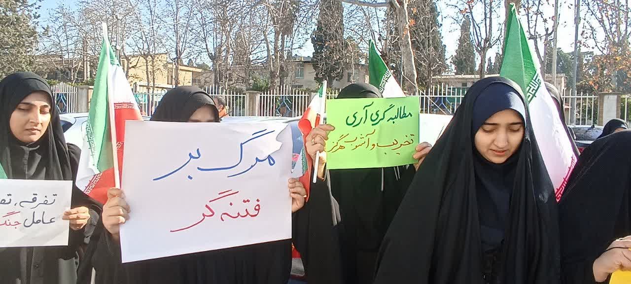 حاضران با در دست داشتن پلاکاردهایی با مضامین «مرگ بر فتنهگر»، «آزاده باش دانشجو حرفتو علمی بزن»، «گرانی و تورم خواسته اسرائیل است» و «مطالبات آری تخریب و آشوب هرگز» خشم خود را از اقدامات اخیر اغتشاشگران و حامیان خارجی آنها ابراز کردند.