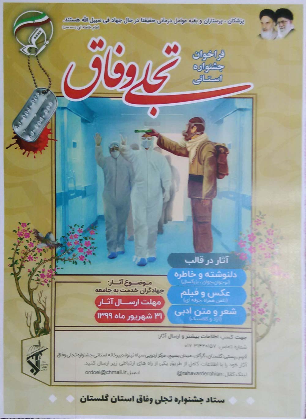 این جشنواره با موضوع جهادگران خدمت به جامعه در روزهای کرونا در 6 محور شعر و متن ادبی، دلنوشته و خاطره، عکس و فیلم برگزار می گردد و علاقهمندان میتوانند آثار خود را در قالب های اعلام شده به این جشنواره ارسال کنند.